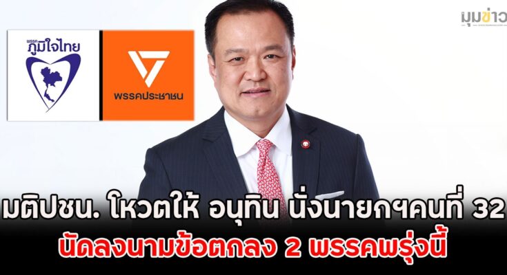 ล่าสุด ในช่วงเย็น มีรายงานข่าวแจ้งว่า ทางพรรคประชาชน มีมติจะโหวตให้ นายอนุทิน ชาญวีรกูล หัวหน้าพรรคภูมิใจไทย เป็นนายกฯ คนที่ 32 โดยในช่วงเช้าวันที่ 3 ก.ย. แกนนำทั้ง 2 พรรคจะไปลงนามข้อตกลงร่วมกันของทั้ง 2 พรรค ที่รัฐสภา
