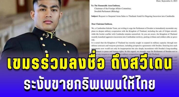 ระบุว่า กัมพูชา นักศึกษากัมพูชาในสหรัฐฯ ปริญญาโทสาขากิจการระหว่างประเทศ ออกแคมเปญร่วมลงชื่อชาวกัมพูชา และเตรียมส่งหนังสือถึง ประธานคณะกรรมการกิจการต่างประเทศสวีเดน เรื่องคำร้องขอระงับการขายอาวุธให้แก่ประเทศไทย กรณีนำมารุกรานกัมพูชา ปัจจุบัน มีผู้ลงชื่อแล้ว 1,214 คน