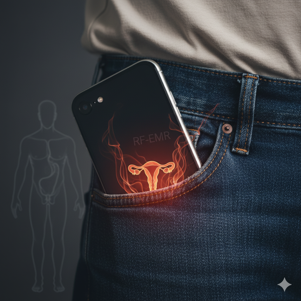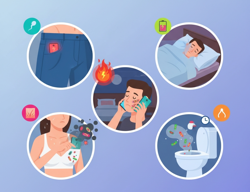 การเก็บโทรศัพท์ไว้ในกระเป๋ากางเกง (โดยเฉพาะกระเป๋าหน้า) เป็นสิ่งที่ทำกันมากที่สุด แต่ก็เป็นอันตรายอย่างยิ่งสำหรับเพศชาย โทรศัพท์มือถือปล่อยคลื่นแม่เหล็กไฟฟ้าความถี่วิทยุ (RF-EMR) และยังสามารถเพิ่มอุณหภูมิบริเวณที่สัมผัสได้เมื่อเครื่องร้อนขึ้น