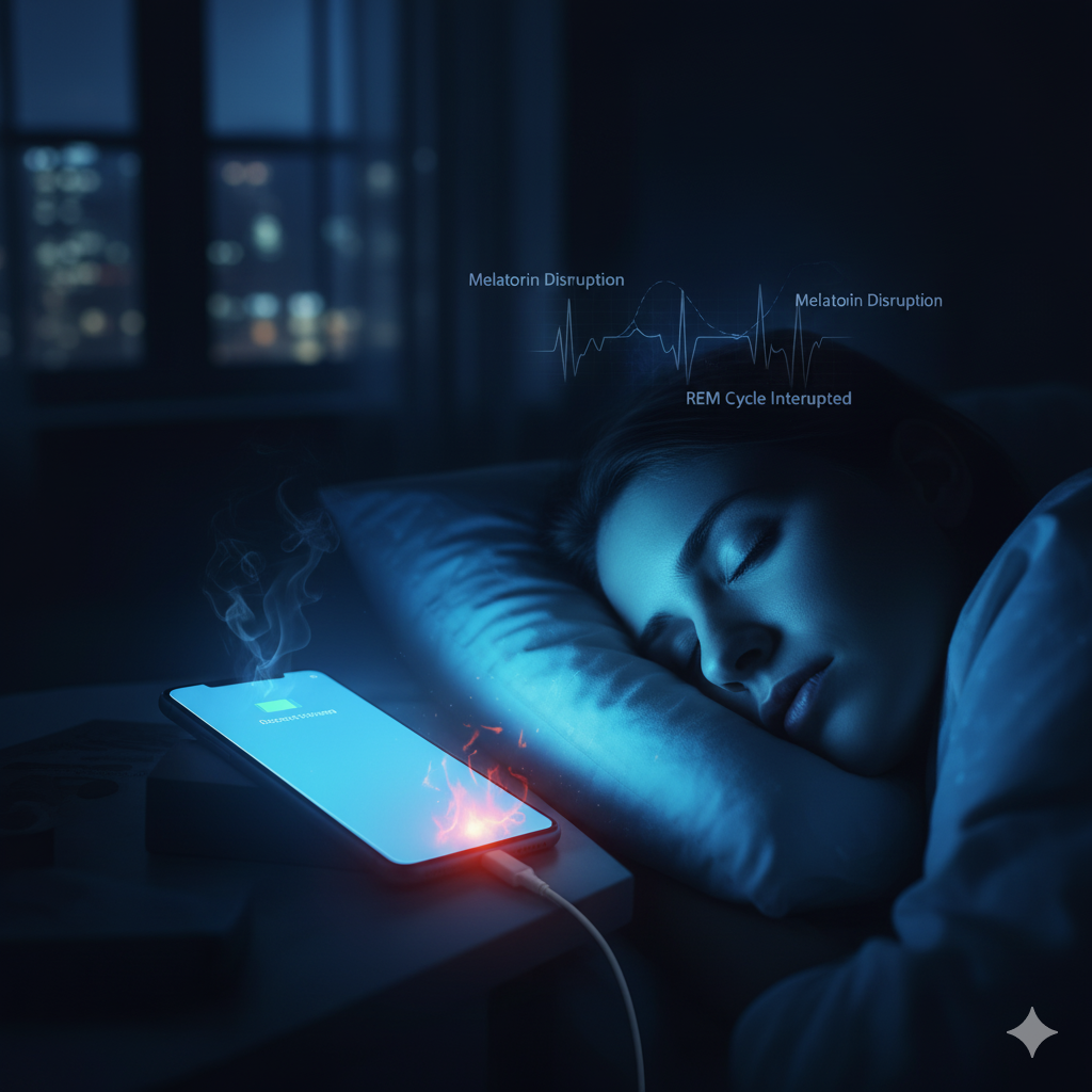 การถูกรบกวนอย่างต่อเนื่องจากเสียงแจ้งเตือน การสั่น หรือแสงที่อยู่ข้างศีรษะโดยตรง จะไปลดช่วงหลับลึก (REM Sleep) ซึ่งอาจทำให้เกิดอาการปวดศีรษะ หูอื้อ และความอ่อนเพลียเรื้อรังได้ ประการที่สอง หากมีการชาร์จโทรศัพท์ข้ามคืน หรือวางไว้ใต้หมอน/ผ้าห่ม ความร้อนที่สะสมระหว่างการชาร์จและการทำงานจะไม่สามารถระบายออกไปได้
