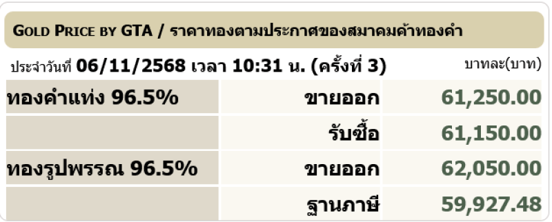 สำหรับราคาทองคำเปิดตลาดประจำวันที่ 6 พฤศจิกายน 2568 เปิดตลาดปรับขึ้น 100 บาท ในครั้งที่1 ต่อมามีการปรับขึ้นในครั้งที่ 2 และ 3 โดยทองรูปพรรณขายออกบาทละ 62,050 ตามข้อมูลจากเว็บไซต์ของ สมาคมค้าทองคำ เมื่อเวลา 10.31 น.