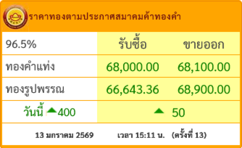 สมาคมค้าทองคำ รายงานว่า ราคาทองวันนี้ 13 มกราคม 2569เวลา 15:11 น. ราคาทองครั้งที่ 13 เพิ่มขึ้น 50 บาท ทองคำแท่งบาทละ 68,100 บาท ทองรูปพรรณบาทละ 68,900 บาท ราคาทองวันนี้ 13 ม.ค. 69 ราคาทองคำแท่ง และราคาทองรูปพรรณ