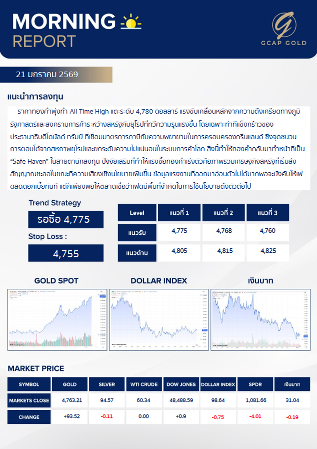 เเนะนำการลงทุนด้านทองคำ รอบเช้าวันนี้ 21 มกราคม 2569 โดย บริษัท จีแคป จำกัด ราคาทองคำพุ่งทำ All Time High แตะระดับ 4,780 ดอลลลาร์ แรงขับเคลื่อนหลักจากความตึงเครียดทางภูมิ รัฐศาสตร์และสงครามการค้าระหว่างสหรัฐกับยุโรปที่ทวีความรุนแรงขึ้น โดยเฉพาะท่าทีแข็งกร้าวของประธานาธิบดีโดนัลด์ ทรับป์ ที่เชื่อมมาตรการภาษีกับความพยายามในการครอบครองกรีนแลนด์ ซึ่งจุดชนวนการตอบโต้จากสหภาพยุโรปและยกระดับความไม่แน่นอนในระบบการค้าโลก
