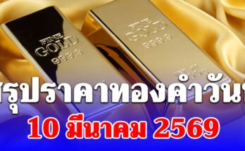 สมาคมค้าทองคำ รายงานว่า ราคาทองวันนี้ 10 มีนาคม 2569 เวลา 13.39 น. ราคาทองผันผวน 10 ครั้ง เพิ่มรวม 100 บาท ส่งผลให้ราคาทองคำล่าสุดอยู่ที่