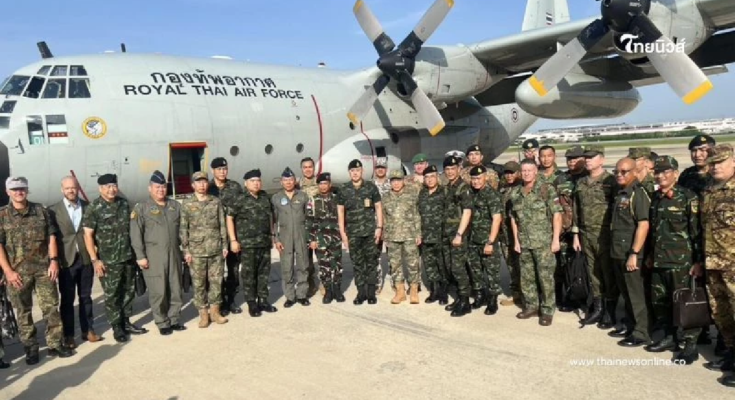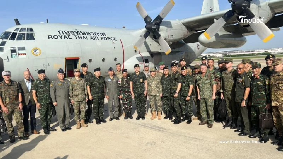นายรัศม์ ชาลีจันทร์ ผู้ช่วยรัฐมนตรีประจำกระทรวงการต่างประเทศ พล.ต.นฤดล สุขมา เจ้ากรมจเรทหารทบ ในฐานะผู้ตรวจสอบข้อเท็จจริง พล.ต.ประเสริฐ หมวดเชียงคะ ผู้อำนวยการสำนักวิเทศสัมพันธ์ นำเอกอัคราชทูต อุปทูต 11 ประเทศ คณะทูตทหาร 22 ประเทศ 26 คน สื่อต่างประเทศ สื่อไทย และเจ้าหน้าที่หน่วยงานความมั่นคง เดินทางไปที่กองบิน 21 (บน.21) จ.อุบลราชธานี