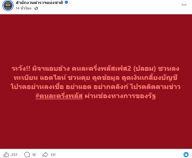 วันที่ 6 เมษายน 2569 เพจสำนักงานตำรวจแห่งชาติ ออกประกาศแจ้งเตือนประชาชนทั่วประเทศ ให้ระวังกลุ่มมิจฉาชีพที่แอบอ้างโครงการรัฐ โดยเฉพาะโครงการคนละครึ่งเฟส 2 ปลอม ซึ่งกำลังถูกนำมาใช้เป็นเครื่องมือหลอกลวงในโลกออนไลน์