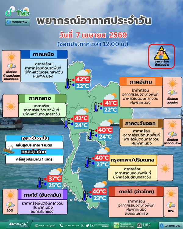 07 เมษายน 2569 พยากรณ์อากาศ 24 ชั่วโมงข้างหน้า ประเทศไทยตอนบนมีอากาศร้อนโดยทั่วไปและมีอากาศร้อนจัดบางพื้นที่ กับมีฟ้าหลัวในตอนกลางวัน เนื่องจากความกดอากาศต่ำ เนื่องจากความร้อนปกคลุมประเทศไทยตอนบน ในขณะที่มีลมใต้ และลมตะวันตกเฉียงใต้กำลังอ่อนพัดปกคลุมในบริเวณดังกล่าว ทำให้ประเทศไทยตอนบนมีฝนฟ้าคะนองเล็กน้อยบางแห่ง ขอให้ประชาชนดูแลรักษาสุขภาพเนื่องจากสภาพอากาศที่ร้อนถึงร้อนจัด โดยหลีกเลี่ยงการทำงานหรือการประกอบกิจกรรมในที่โล่งแจ้งเป็นระยะเวลานาน รวมทั้งระวังอันตรายจากฝนฟ้าคะนองที่อาจเกิดขึ้นได้บางพื้นที่ไว้ด้วย