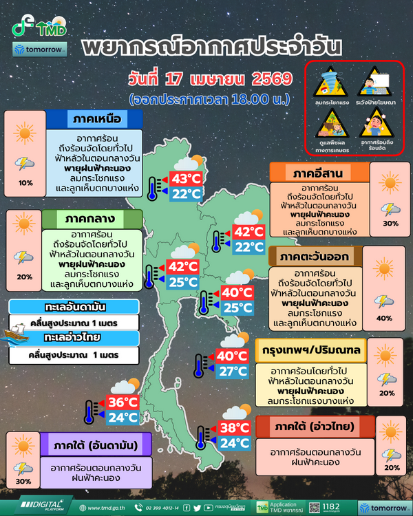 17 เมษายน 2569 พยากรณ์อากาศ 24 ชั่วโมงข้างหน้า บริเวณประเทศไทยตอนบนจะมีพายุฤดูร้อนเกิดขึ้น โดยมีลักษณะของพายุฝนฟ้าคะนอง ลมกระโชกแรง และลูกเห็บตกบางแห่ง รวมถึงอาจมีฟ้าผ่าเกิดขึ้นได้บางพื้นที่ เนื่องจากบริเวณความกดอากาศสูงหรือมวลอากาศเย็นได้แผ่ลงมาปกคลุมประเทศจีนตอนใต้ และทะเลจีนใต้ ส่งผลทำให้มีลมใต้และลมตะวันออกเฉียงใต้พัดนำความชื้นจากอ่าวไทยและทะเลจีนใต้เข้าปกคลุมภาคตะวันออกเฉียงเหนือ ภาคตะวันออก และอ่าวไทยตอนบน ในขณะที่บริเวณดังกล่าวมีอากาศร้อนถึงร้อนจัด
