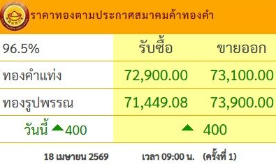 ราคาทองคำประจำวันที่ 18 เม.ย.2569 ราคาปรับขึ้น 400 บาท เมื่อเปรียบเทียบกับราคาสุดท้ายของเมื่อวันที่ 17 เม.ย.ที่ผ่านมา โดยทองรูปพรรณขายออกที่บาทละ 73,9000 บาท อ้างอิงข้อมูลล่าสุดจาก สมาคมค้าทองคำ ที่เผยแพร่ผ่านทางเว็บไซต์ เมื่อเวลา 09.00 น.ที่ผ่านมา
